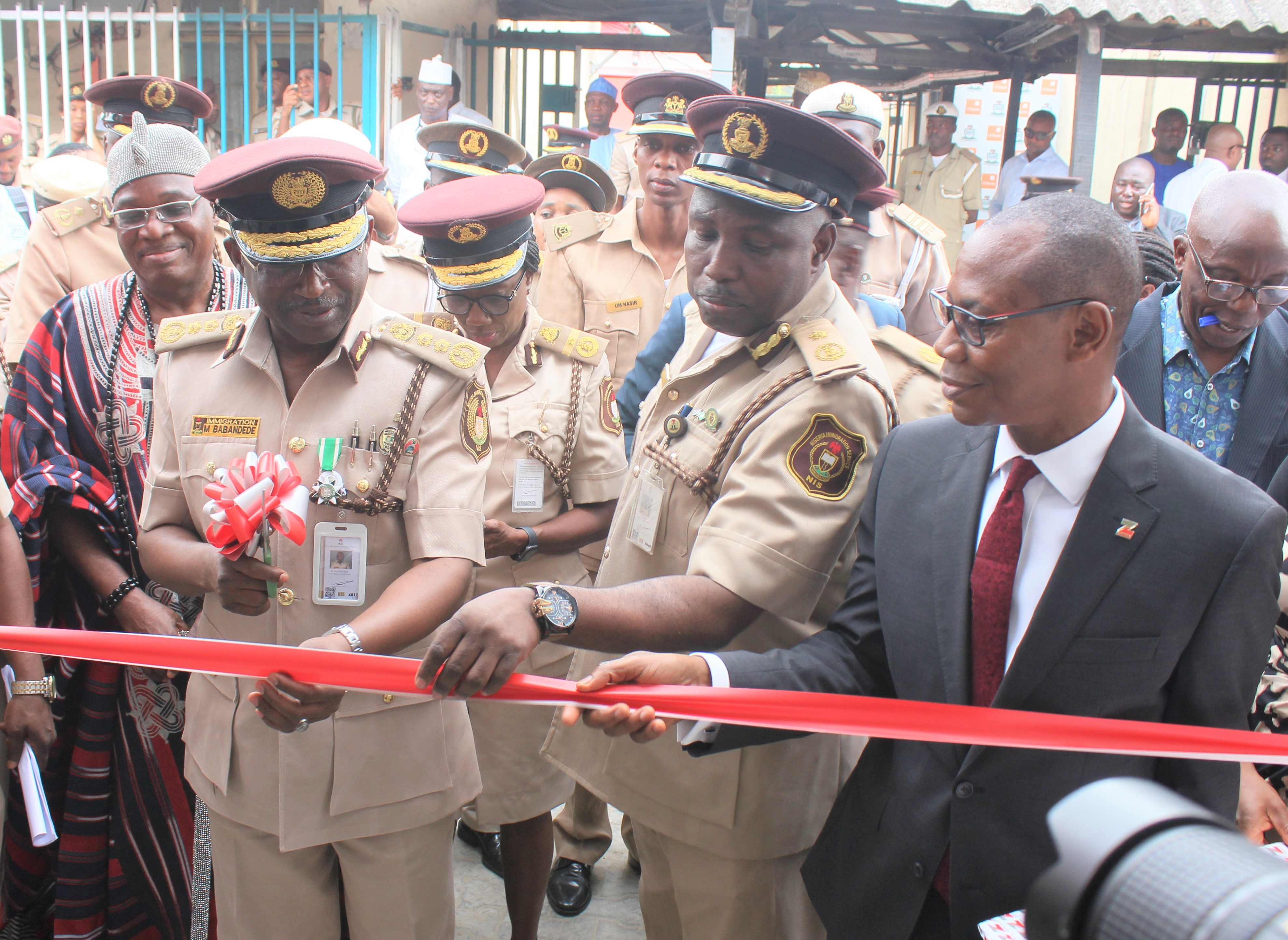 L-R: HRH, Oba Adebayo Akolade, Olora of Ora kingdom, Kwara State; Muhammad Babandede (MFR), Comptroller General, Nigeria Immigration Service; Munir Yari, Deputy Comptroller General & PCO, Ikoyi passport office and Lanre Oladimeji, Group Head, Retail Banking, Zenith Bank Plc, at the commissioning of the office building donated by Zenith Bank to the Nigeria Immigration Service, Ikoyi Office on Monday.