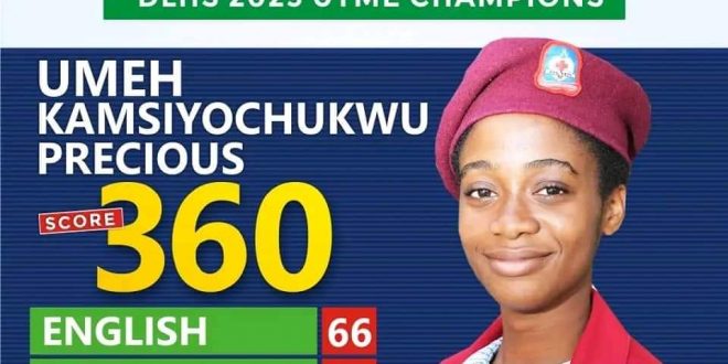 Miss Umeh, Kamsiyochukwu Nkechinyere emerged as the top scorer with an outstanding mark of 360, making her the highest achiever in the 2023 UTME.