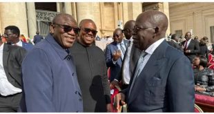 By, Onome Jackson President Bola Tinubu, Mr Peter Obi, the Labour Party Presidential candidate, and former Ekiti governor Kayode Fayemi met at Pope Leo XIV’s installation mass on Sunday in Rome. Fayemi sighted President Tinubu, where he sat with other leaders and asked Obi to follow him to pay homage to the Nigerian leader. Obi agreed. On getting to the ...